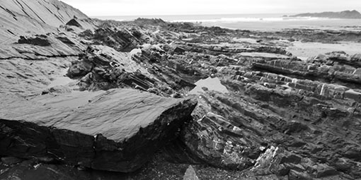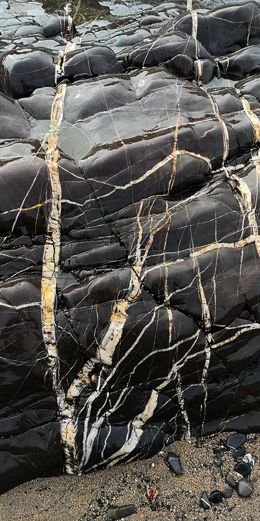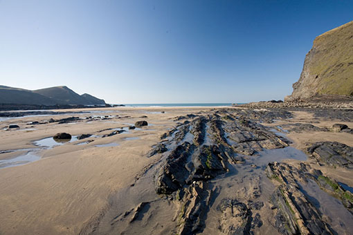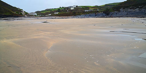 The foreshore is covered with attractive marbled humbug pebbles and fist-sized stones (signs warn against removing souvenirs from the beach) and to the left and right are unusual craggy rocks running to the sea. Most of the beach, when at low tide, is sandy. The surrounding cliffs are well known for their visible folded sedimentary rock formations. Plenty of rock pools at low tide.